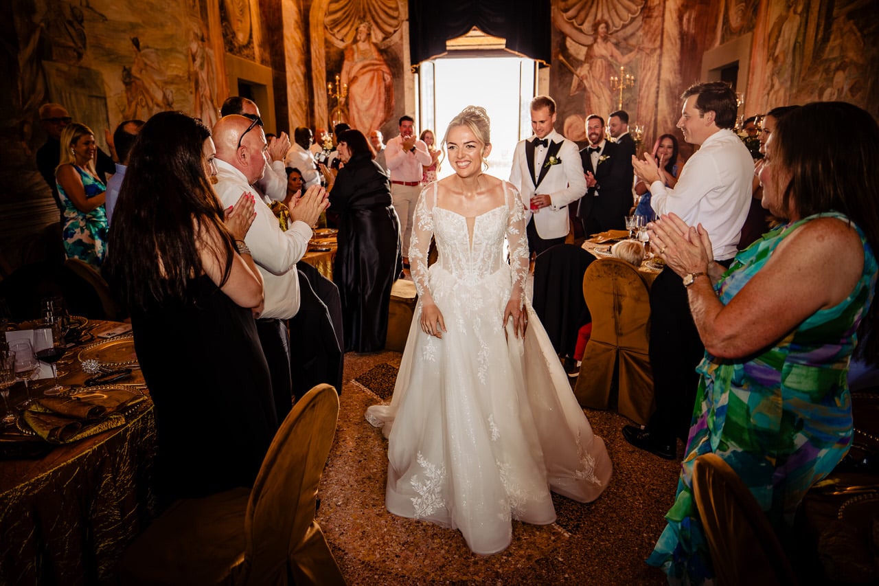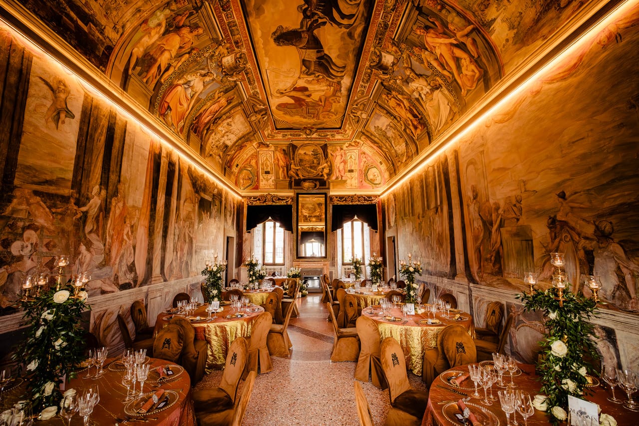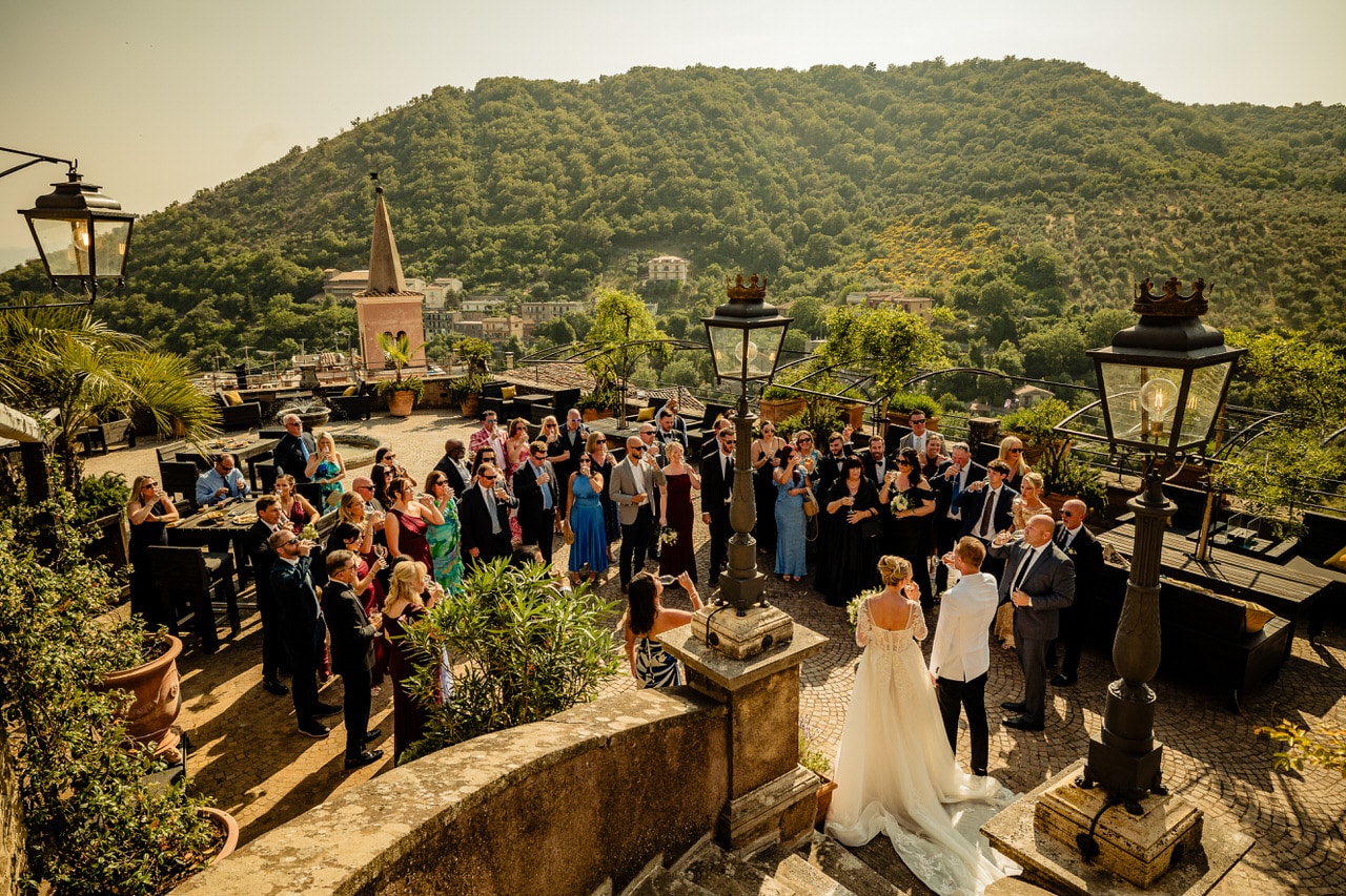 After the ceremony, the celebration truly came alive. Guests enjoyed prosecco and antipasti on the terrace, overlooking the rolling hills of Lazio. Later, dinner was served in the castle’s grand hall, where long tables, candlelight, and Italian dishes created the perfect atmosphere.