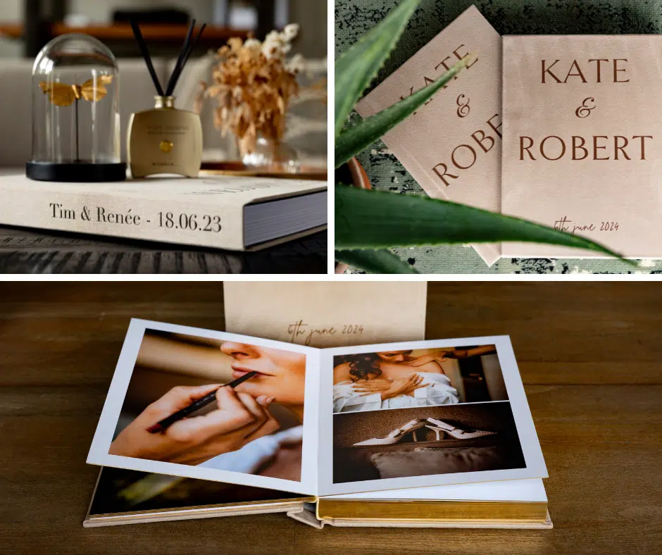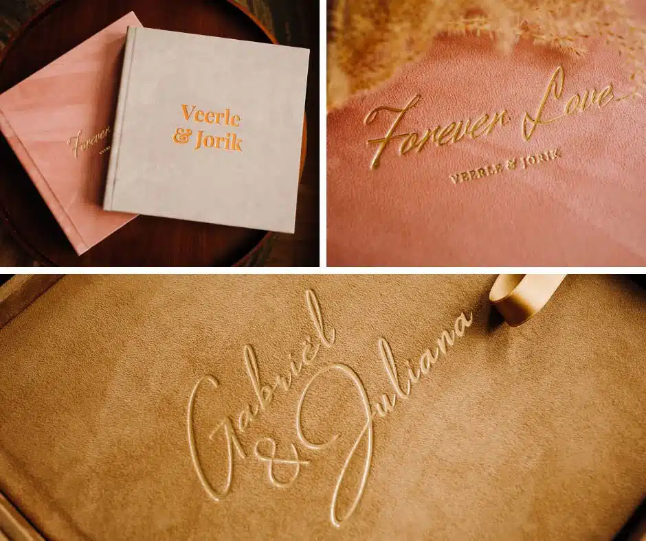 Met embossing krijgen jullie namen, trouwdatum of logo een stijlvolle reliëfafwerking op de cover van het trouwalbum. Een tijdloze keuze die direct luxe uitstraalt en perfect past bij een exclusief trouwalbum.