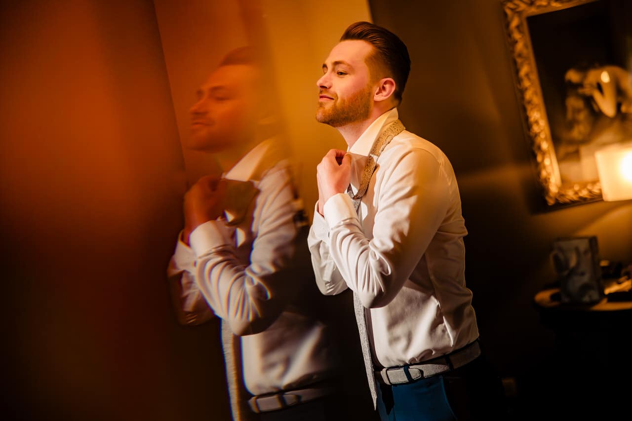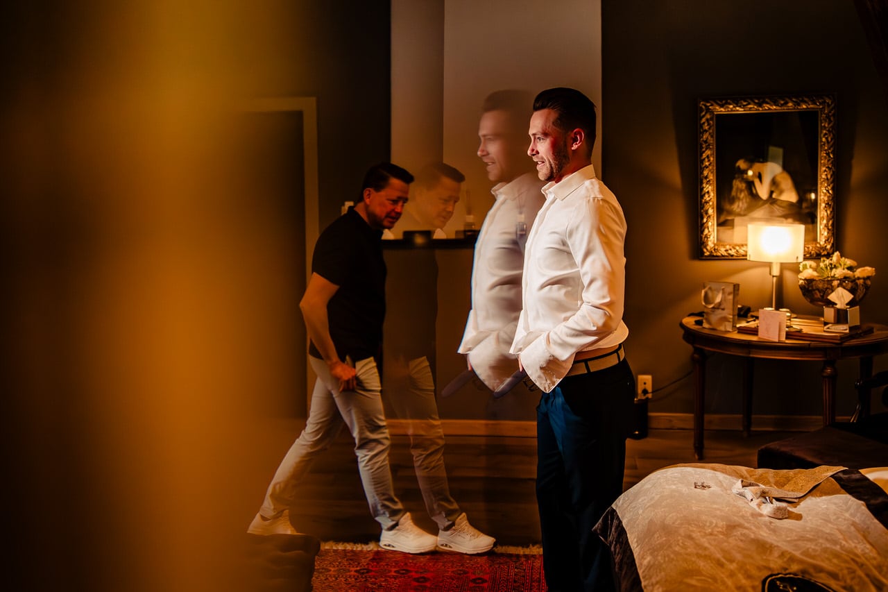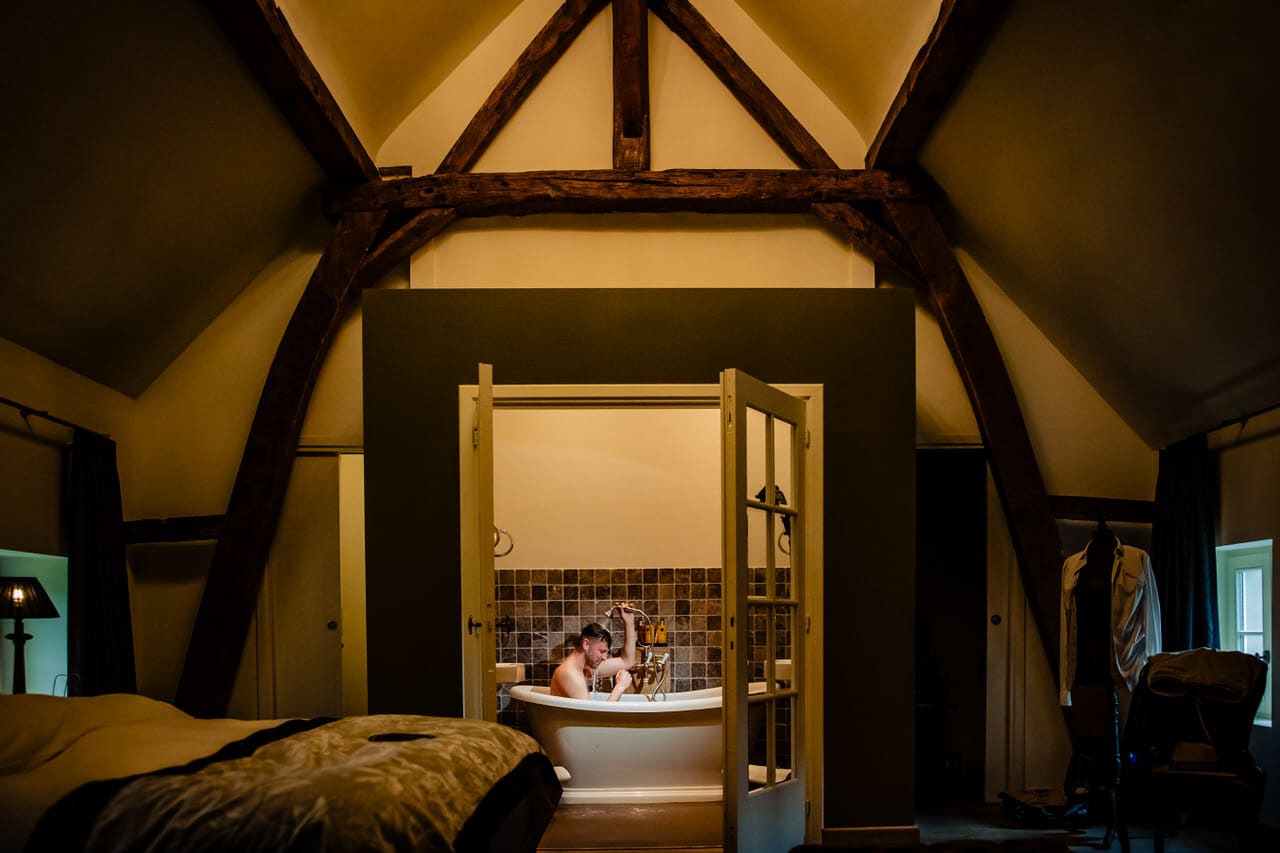 De dag begon vroeg voor Eric en Maartje, die samen met hun naaste familie en vrienden genoten van de voorbereidingen in de prachtig ingerichte kamers van Het Fonteinhof. Terwijl de bruid zich klaarmaakte met haar bruidsmeisjes, werd Eric omringd door zijn vrienden die hem hielpen met de laatste details van zijn outfit. De opwinding en verwachting waren duidelijk voelbaar, en de glimlachen waren overal aanwezig.