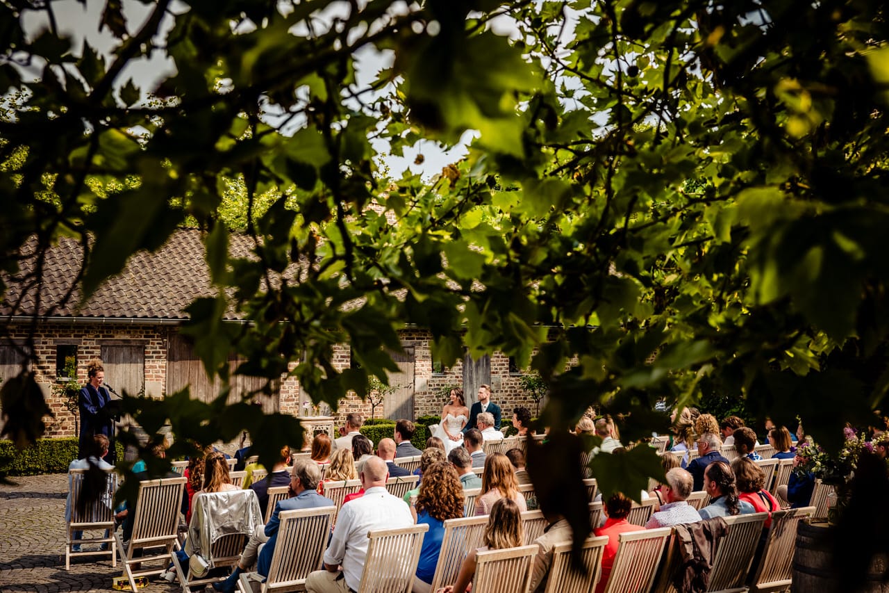 De ceremonie vond plaats in de prachtige tuin van Het Fonteinhof, waar stoelen waren opgesteld met heel veel gezelligheid. De zon scheen helder, en de lucht was gevuld met het zachte gefluister van bladeren en het gezang van vogels. Toen Maartje, stralend in haar betoverende jurk, naar voren liep, kon iedereen de liefde en vreugde in de lucht voelen.