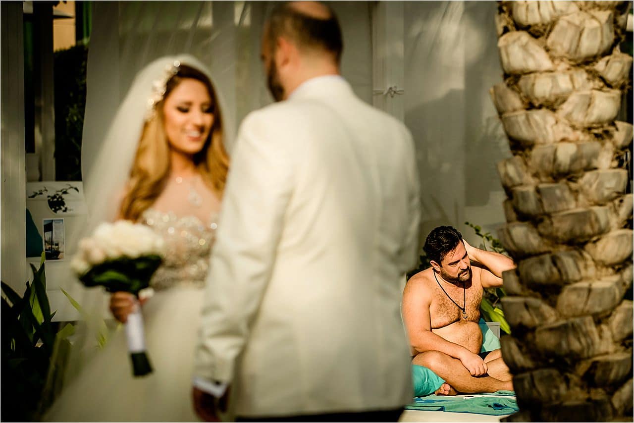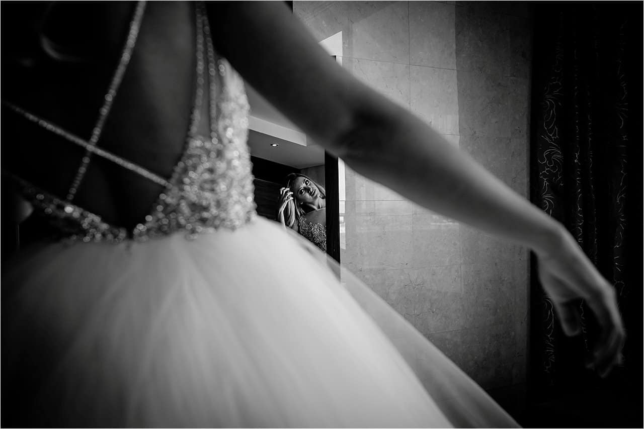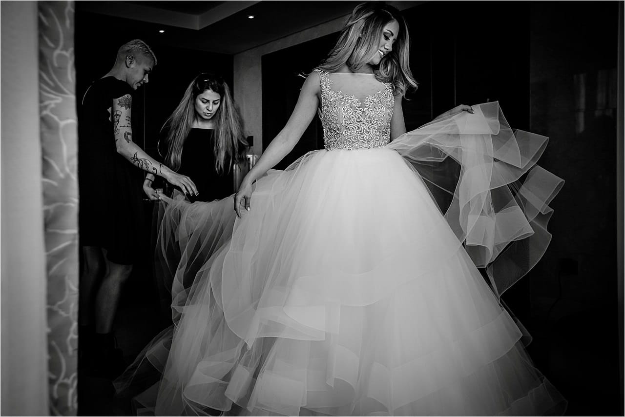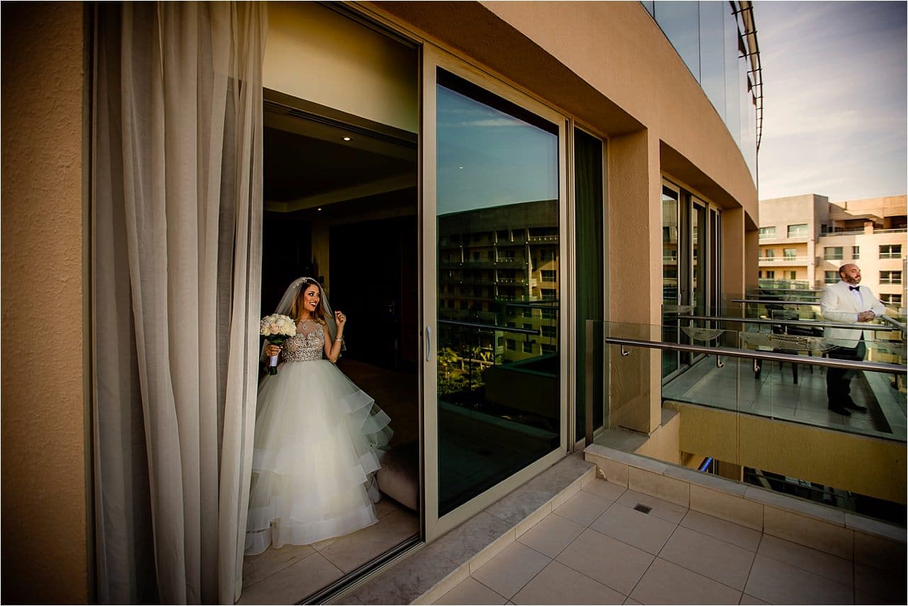 De ceremonie vond plaats op het iconische kunstmatige eiland The Palm Jumeirah, bij het luxe resort Rixos The Palm. De setting was adembenemend: een turquoise zee, witte stranden en de skyline van Dubai op de achtergrond. Zach bereidde zich voor in de ene kamer, Shadi in de andere – een georganiseerde chaos waar ik als trouwfotograaf stiekem van hou.