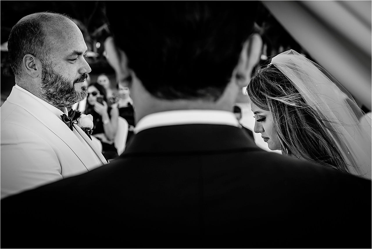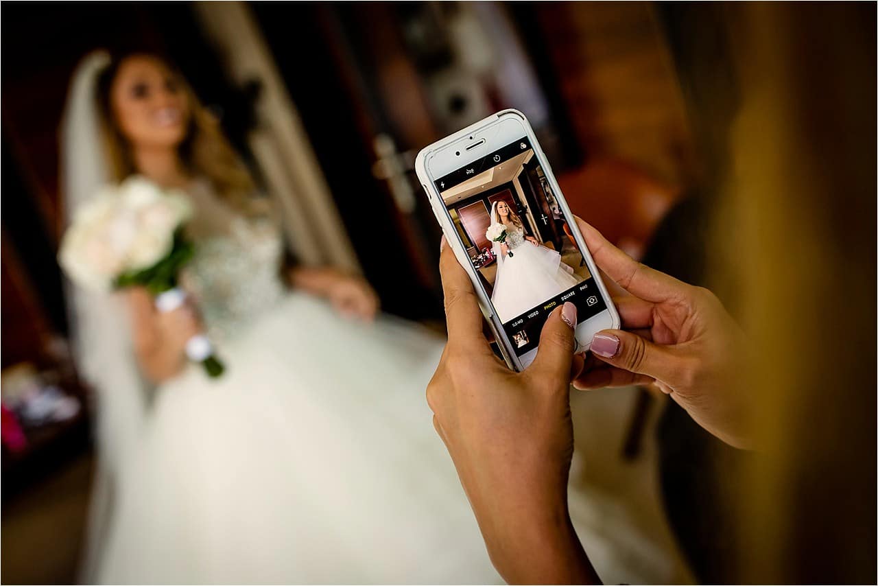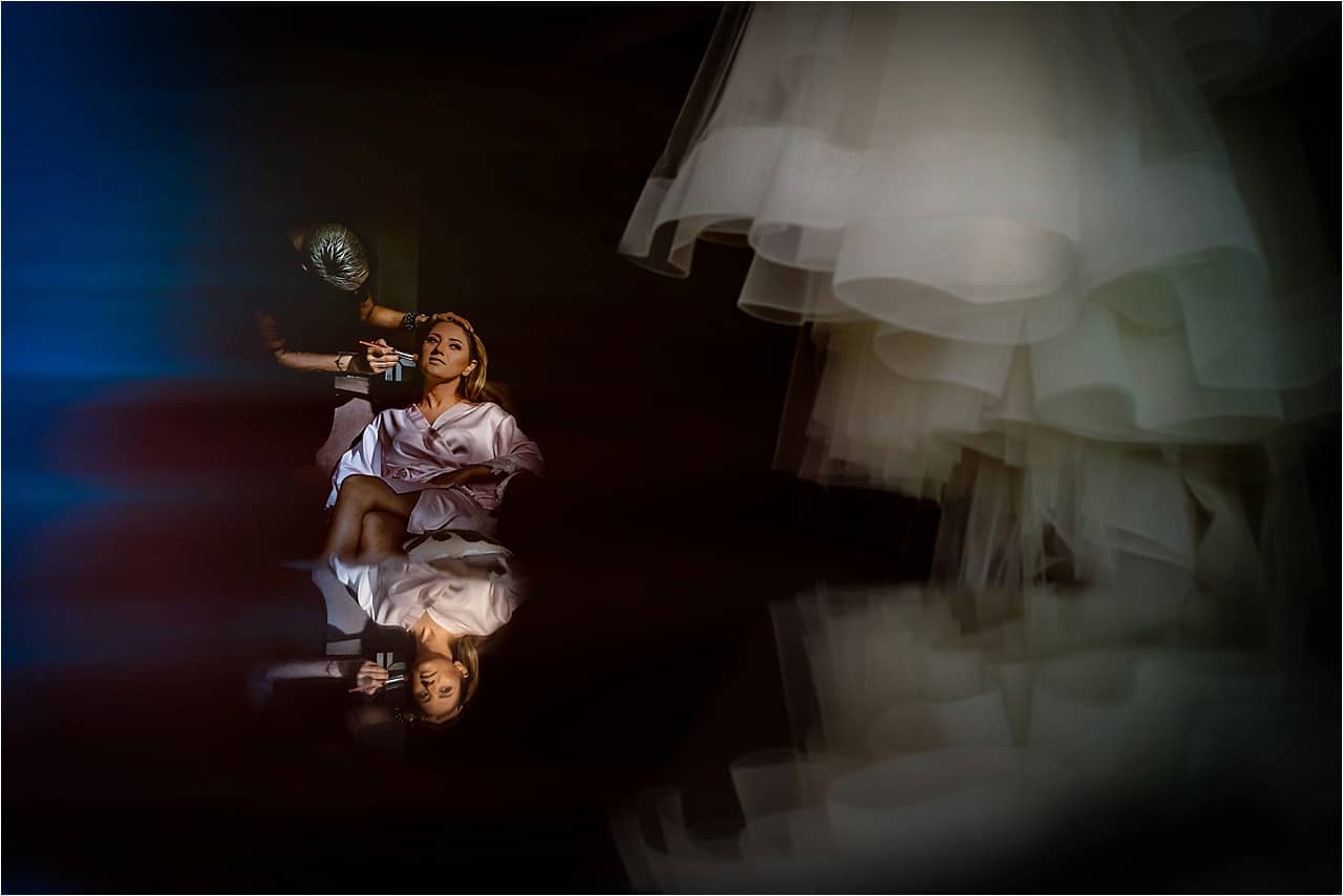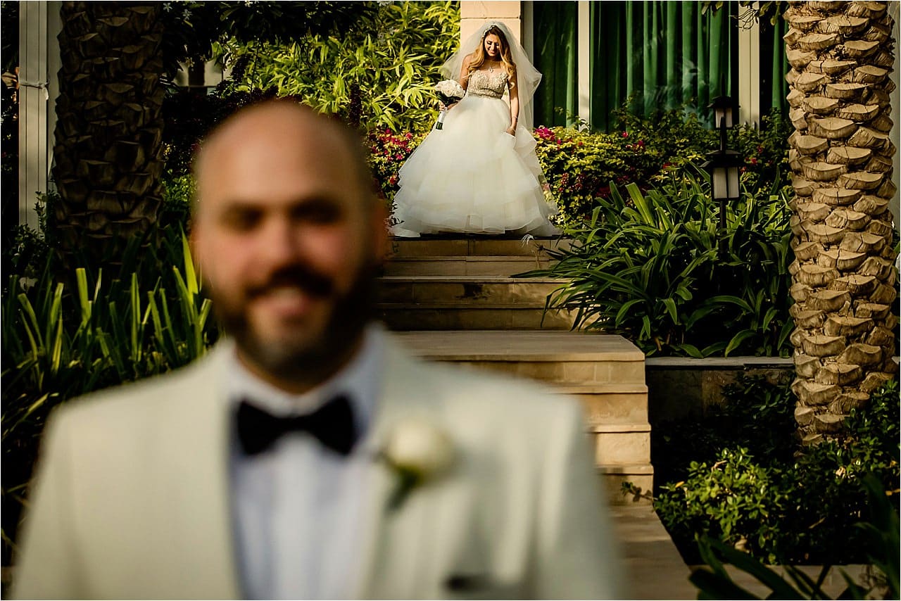 De ceremonie vond plaats op het iconische kunstmatige eiland The Palm Jumeirah, bij het luxe resort Rixos The Palm. De setting was adembenemend: een turquoise zee, witte stranden en de skyline van Dubai op de achtergrond. Zach bereidde zich voor in de ene kamer, Shadi in de andere – een georganiseerde chaos waar ik als trouwfotograaf stiekem van hou.