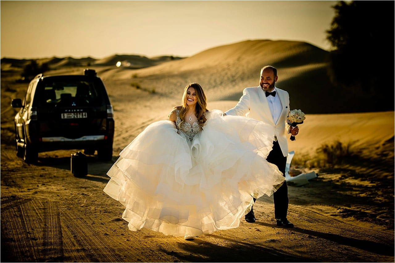 Alsof de bruiloft zelf niet genoeg was, sloten we af met een spectaculaire fotoshoot in downtown Dubai en de omliggende woestijn. Van moderne architectuur tot de eindeloze zandvlaktes: het contrast leverde waanzinnige beelden op die de liefde van Zach & Shadi perfect weerspiegelen.